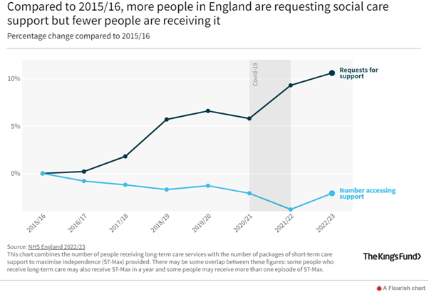 The graph below from the Kings Fund paints a stark picture of Social Care. Demand for support and care from Social Services continues to rise, with 1.37 million people making new requests for help during the last year. At the same time, the number of older people receiving services has fallen by 44,000 (7.7%) since 2015/16. When increases in population size are taken into account, the fall is even starker. In 2015/16, 6.0% of people aged 65 and over were receiving long-term care but by 2022/23 this had fallen to 5.2%